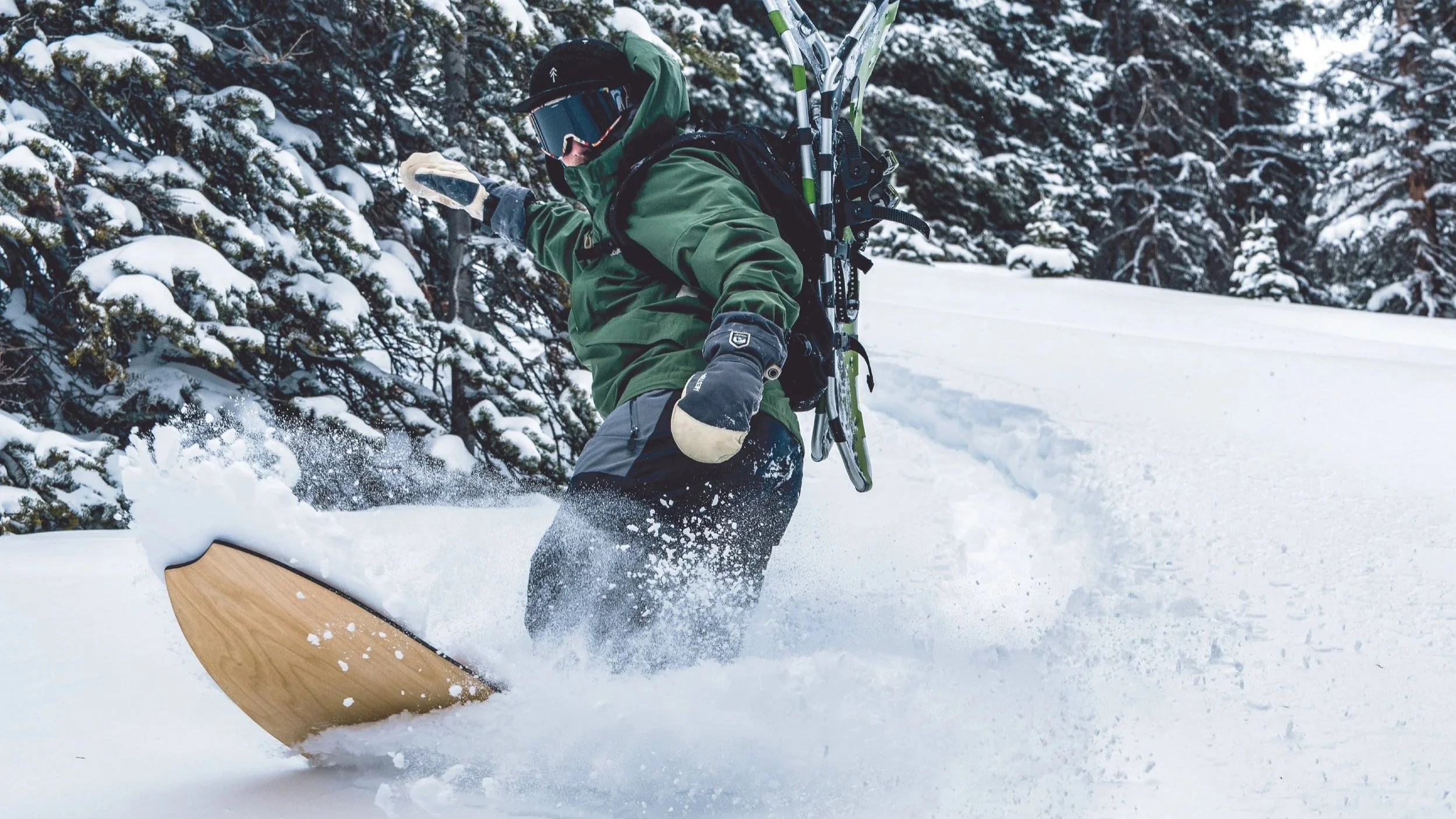 Binding less snowboard designed for the Colorado backcountry and backyard hill. Design combines elements from surf, skate and snowboards. Manufactured locally in Denver Colorado.